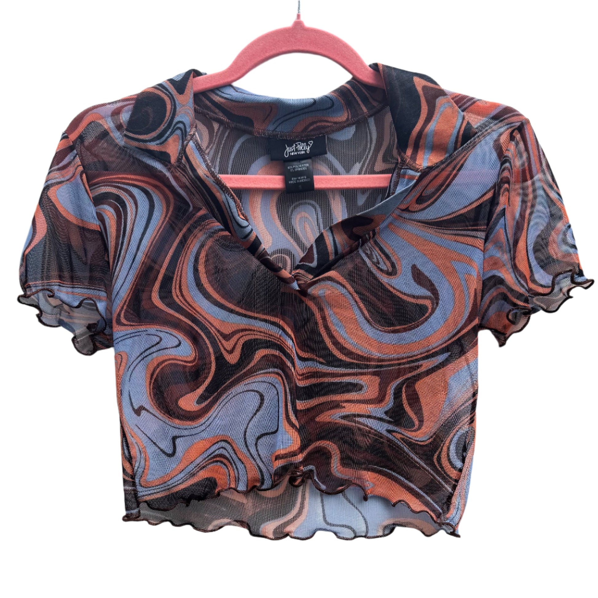 This Y2K style crop features a marbled pattern and super cute ruffled edges. Polyester and spandex, size Small. Brand is Just Polly